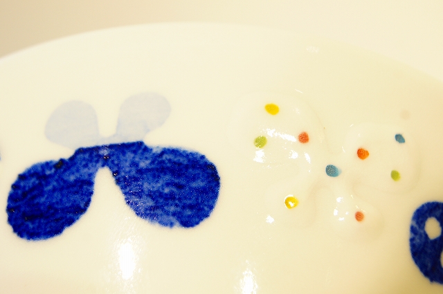 白磁に呉須(藍色)の染付に、イッチンという技法で表面の絵柄に凹凸が施してあります。