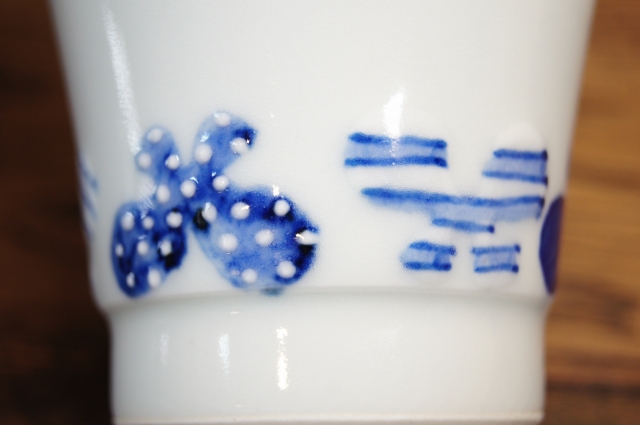 白磁に呉須(藍色)の染付に、イッチンという技法で表面の絵柄に凹凸が施してあります。